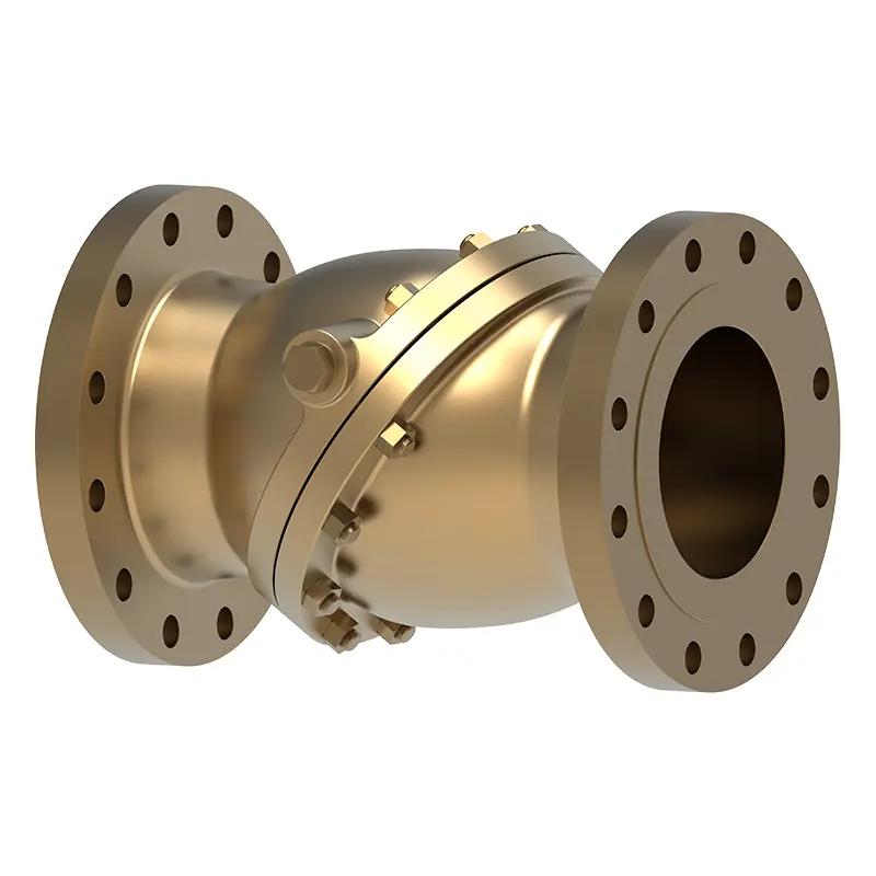 วาล์วตรวจสอบแผ่นดิสก์ที่เอียงทองสัมฤทธิ์ใช้โครงสร้างแผ่นดิสก์เอียงเพื่อให้ได้ทางเดียวกับการควบคุมของเหลว มันทำจากการสึกหรอทนต่อการกัดกร่อนและสีบรอนซ์ที่มีความแข็งแรงสูง เหมาะสำหรับระบบท่อที่มีความต้องการสูงสำหรับความเสถียรในการไหลของของไหลและจำเป็นต้องหลีกเลี่ยงค้อนน้ำเช่นระบบทำความเย็นของอุปกรณ์ที่มีความแม่นยำบางระบบระบบน้ำประปาของอาคารสูงและปั๊มหรือระบบน้ำประปาและการระบายน้ำด้วยน้ำหรือน้ำมันเป็นสื่อ